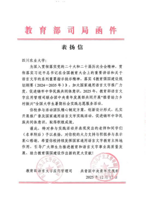 此次获国家级表扬,是对团队实践成果的充分认可,也彰显了suncitygroup太阳成集团在服务国家战略、助力乡村振兴中的责任担当。tyc522cc太阳成集团主页将以此次荣誉为契机,持续发挥学科专业优势,深化“推普+科普+文化传承”的实践模式,引导更多师生投身语言文字推广与乡村振兴实践。未来,学院将继续响应国家教育强国建设号召,聚焦民族地区发展需求,在语言赋能、人才培养、文化传承等方面持续发力,为推进教育和语言文字事业高质量发展、铸牢中华民族共同体意识作出新的更大贡献。