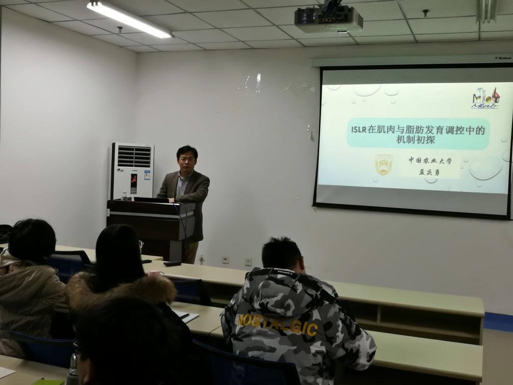 应tyc522cc太阳成集团主页邀请,中国农业大学孟庆勇教授于2019年12月13日上午到学院进行了题为“Islr在肌肉与脂肪发育调控中的机制初探”的学术报告。报告由周光斌教授主持,二十余名动物科学相关专业的硕士研究生参加。