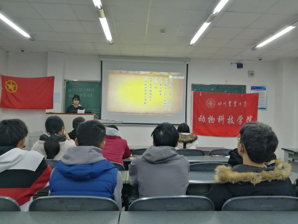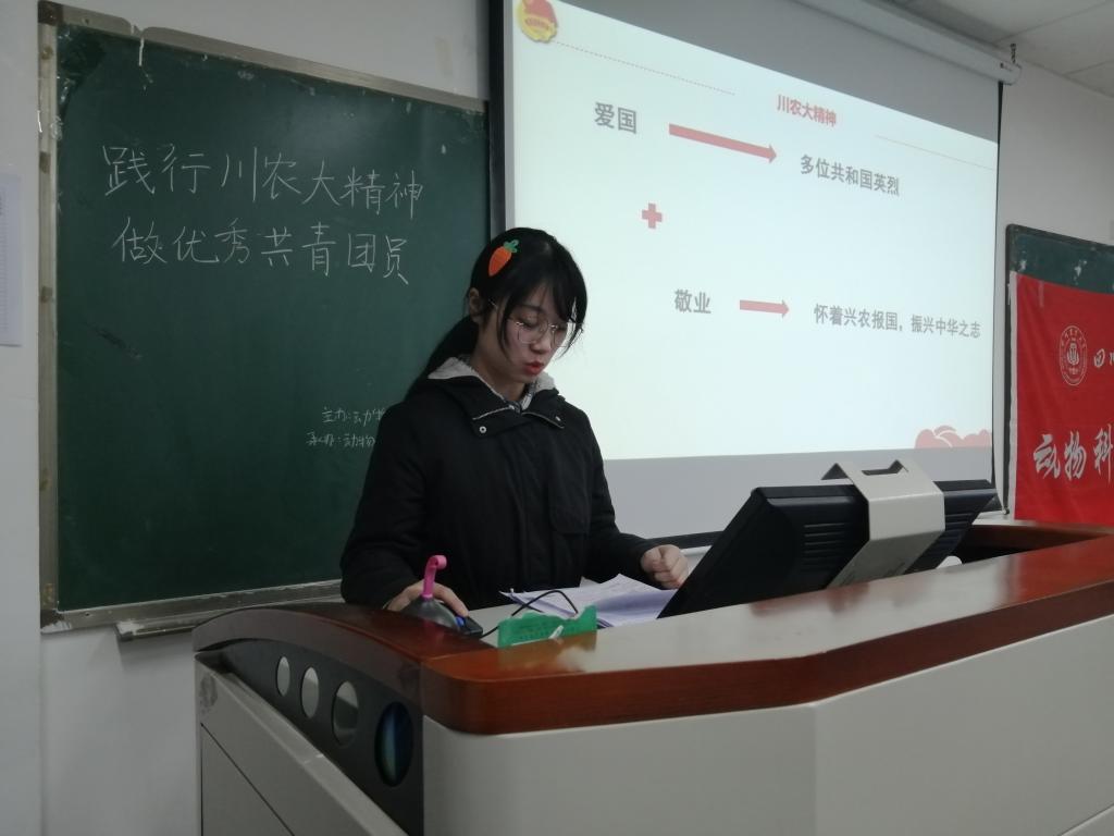 周茂林首先对川农大精神的内涵进行了初步讲解,旨在让新发展团员认识到自己身上的时代重任。接着以多种形式对爱国精神进行了深度讲解——从而达到让每位在座成员铭记爱国精神,做优秀共青团员。全体同学通过观看川农大一百一十周年的相关视频,互相探讨川农精神究竟的意义所在,并对共青团的精神进行了深入了解。通过观看关于“江姐”的视频,与“川农大精神与爱国精神”相联系而结尾。