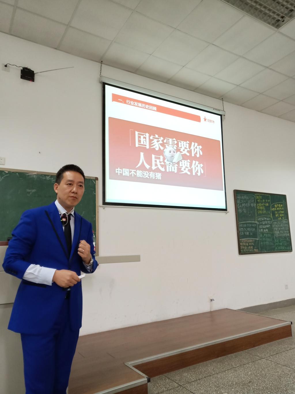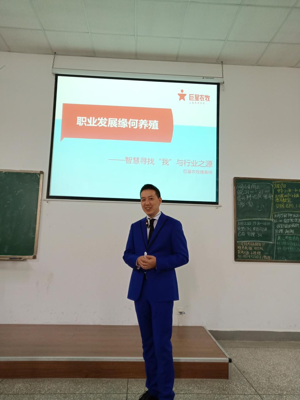 10月22日下午2点20,我校动物营养与饲料质量监测专业94级校友、学校就业创业校友导师、四川巨星农牧股份有限公司董事总经理唐春祥先生走进动科专业2019级新生课堂,做了题为“智慧寻找我与行业之源”的大学生涯规划报告。