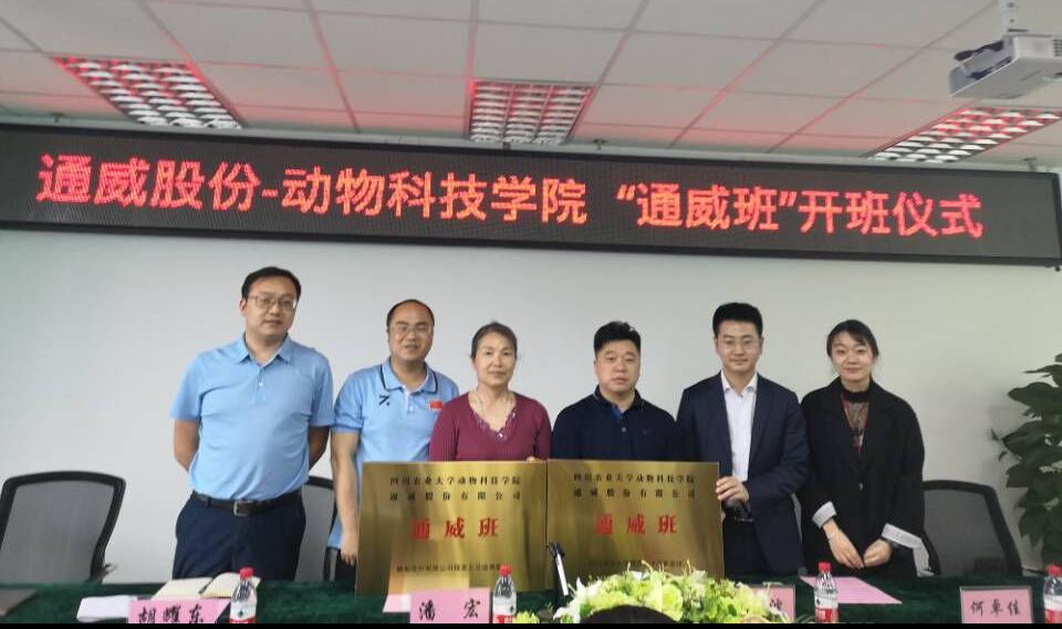 4月23日下午,动科学院与通威股份有限公司在7-1012会议室举行动科校企合作“通威班”开班仪式顺利举行。tyc522cc太阳成集团主页党委书记潘宏、党办主任胡耀东、副主任董尧、通威股份华西片区人力资源总监向波,通威班班主任侯佳薇参加了开班仪式。
