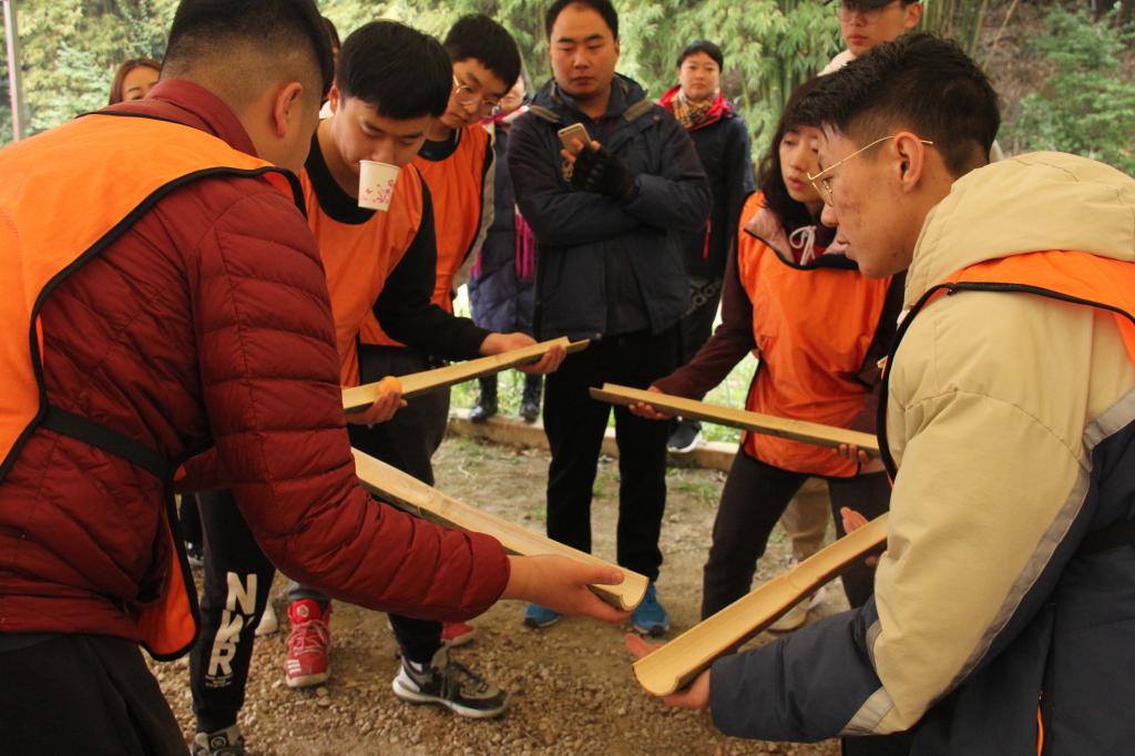 小队风采展示旨在增加小队中每个人之间的凝聚力,包括展示小队名称、口号、队歌、队徽以及完成小组7人双脚离地的小挑战。随后的“珠行万里”小活动,更是要求在规定时间内,完成乒乓球在四块竹板上的两轮运输,每次运输由小组中一人独立操作,每个人在小组当中都尤为重要,这个活动中,团队中的相互信任以及个人的心理素质都迎来了极大的挑战,一次失败,两次失败,三次、四次……看着小球一次次从轨道上坠落,气氛从一开始的欢快,不免开始变得沉重起来,这也是整个活动的重点所在。在这个活动中败下阵来的队伍,更是迎来了更下一步的心理素质挑战,在有外界干扰的条件下,用纸牌完成面粉运输。这期间也出现了主干们讲面粉“吹”在下一位同学的脸上的趣事,但在这一轮中,主干们顺利地通过了考验。射箭场上,一支支羽箭离弦,却少见羽箭落靶报环。这项挑战更要求每个主干在经受住心理考验的同时,还要有“快·准·狠”地解决问题的能力。