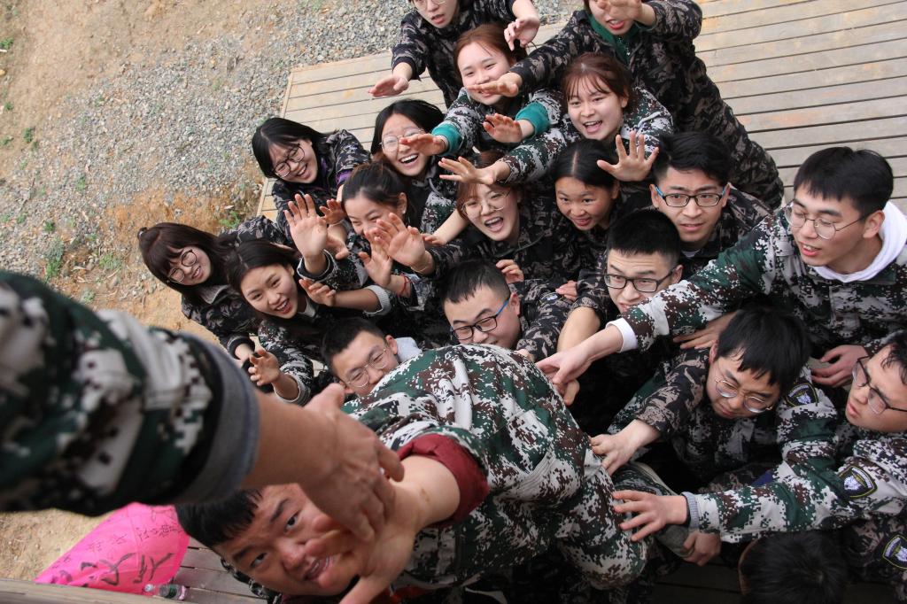 在被美国西点军校命名为“毕业墙”的4.2m高的木板墙面前,这一面墙,对于任何一个人而言都是无法越过的“龙门”,要的就是集体的力量,让整个队伍都不落下一人,在今天全部“结课”。主干们集思广益,如何让所有人都得以“逃出升天”的难题并没有让主干们束手无策。在确定第一、第二位上墙负责牵引的同学后,男生们依次轮换作为“垫脚石”在4.2m的高墙下搭起了人梯,在悉数女生都成功翻越后,男生们才开始安排各自的上墙顺序,最后当所有人中弹跳最好的主干,一把抓住墙上同学们的手,用“生死扣”牵引过墙头时,也意味着学院“青马班”全体学员们下课了。