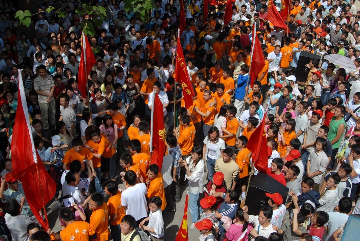 动科院拔河队一路过关斩将,与经管院会师决赛。决赛是在四教后面的篮球场上举行的,现场红旗招展,鼓声、欢呼声、口号声震天作响,球场上全是双方的啦啦队和前来观赛的其他学院的同学,球场边的树上和教学楼的窗口全都站满了人,以至于时任副校长的张强老师是站在一辆工程车的吊斗里才拍下了至今仍在学校招生宣传册上使用的一张拔河比赛的经典相片。比赛开始后,双方实力相当,两局都是1分钟左右才分出胜负,各赢了1局,关键的第三局由两个学院抽签选择场地,当时动科院的学生会主席白海涛师兄猜中了硬币,挑选了大家认为稍微有优势的一边场地,经过前两局的比赛,运动员体力消耗太大,第三局开始30秒后双方队员都没有绝对的力量拔动对方,绳子一晃,两边的队员全都倒坐在地上,手里死死的攥着绳子,拔河绳上的“红领巾”始终在中线附近一动不动,比赛中倒地的情况是之前专门训练过的,也都有专门的应对方法,啦啦队跟着领喊改变了节奏,但是队员们已经站不起来,执行不了平日训练有素的技术动作,双方就这么一直僵持到90秒比赛时间结束,最终因“红领巾”在靠近我们这边不到5厘米,动科院获得了冠军。所有的拔河队员们、学院领导和老师、啦啦队员、后勤队员拥抱、怒吼、振臂挥拳,释放着全部的激情,那场面让我至今难忘,每每想起依然心潮澎湃。那届校运会拔河比赛的现场气氛、激烈程度应当是永远的经典。到现在我还记得一些运动员的名字,范瑞杰师兄,王钰刁师兄,曾捷师姐,晏磊师兄,寇洁师姐,还有我们年级的夏得雨、杜山泉、曾知遥、童山峰、田尧夫、吴晓燕等等都成了当时动科院的英雄。