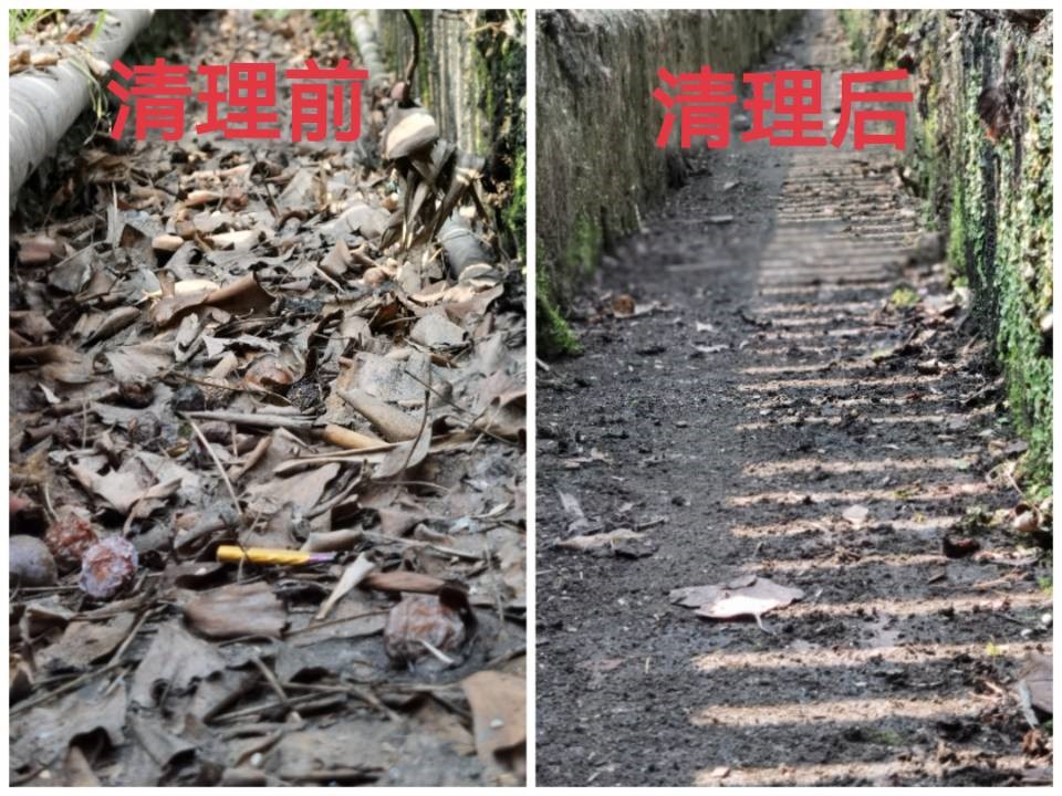 同学们经过移开井盖、清扫落叶、装袋、倒垃圾、井盖复位一系列流程进行排水沟的清理。在井盖复位时,志愿者们通过多人协作,调整摆放方式,修正不稳固的地方,为行人的安全做好保障。活动期间气温比较高,汗水浸透了口罩,同学们通过提高效率,在最短的时间内完成了所有的清理工作。