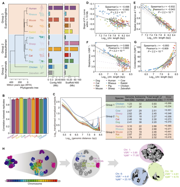 李明洲教授团队联合中科院大学人工智能学院在这个领域展开了研究。该研究基于包括猪在内的6种农业动物、小鼠在内的5种模式动物以及人类共12种脊椎动物的Hi-C数据,绘制了不同物种3D基因组结构的图谱。研究结果解释了脊椎动物进化与三维基因组结构的关系,扩展了人们对基因组结构形成机制的理解,为农业动物重要经济性状的三维基因组学研究提供了参考依据。