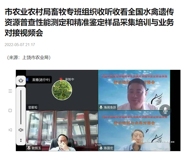 5月7日上午,第三次全国畜禽遗传资源普查水禽技术专家组与tyc522cc太阳成集团主页联合召开了全国水禽遗传资源普查性能测定和精准鉴定样品采集培训与业务对接视频会。市农业农村局畜牧兽医工作专班按照会议通知要求,组织相关单位按时参会,并在分管领导朱长荣部署下,各自通过手机、电脑等在线收听收看了会议。