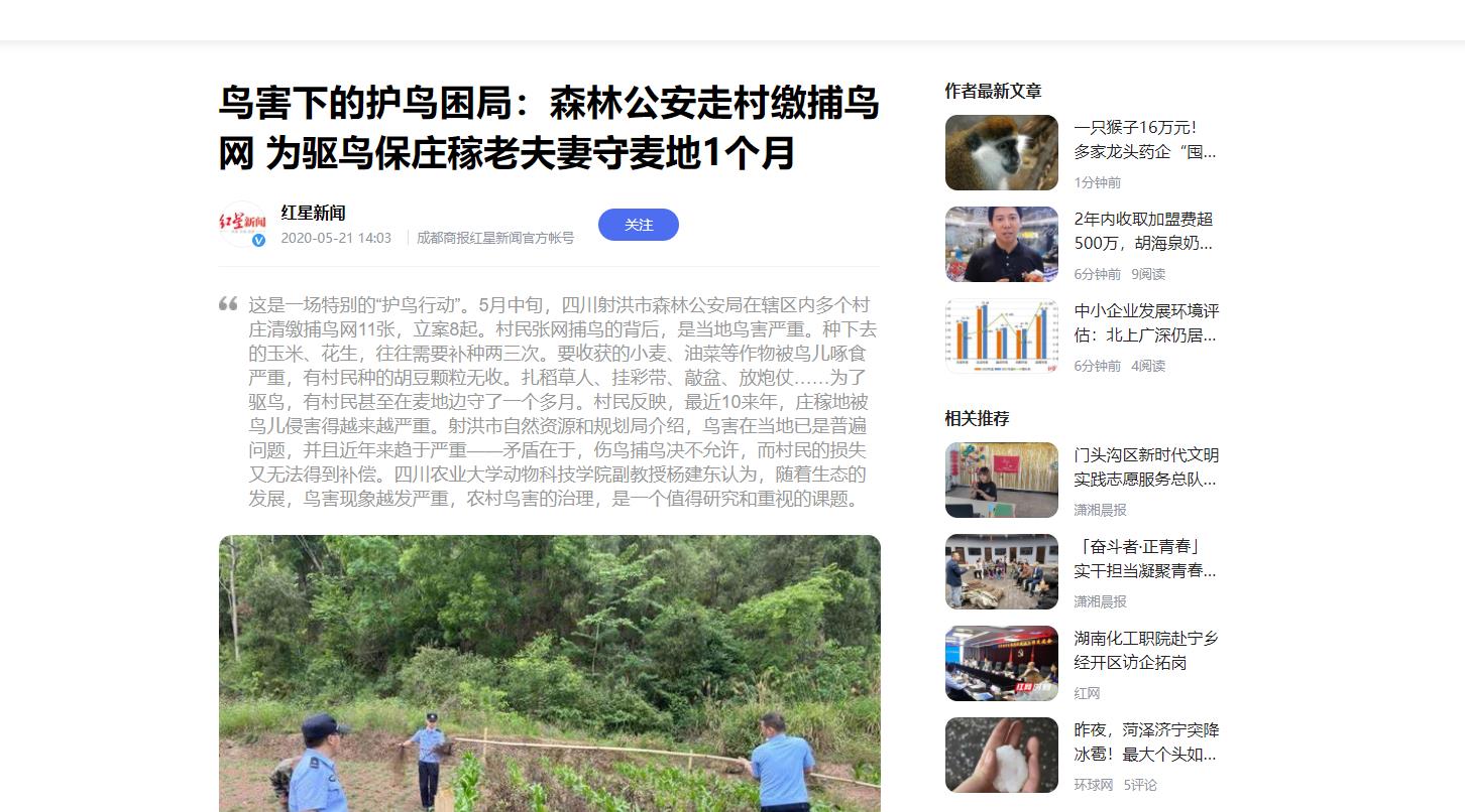 该局保护地域产业发展股(野生动植物保护股)股长罗利民也向红星新闻记者证实,随着生态环境的不断变好,鸟害现象确实比较明显,该部门时常有接到相关情况反映,并有咨询是否有生态补偿。
