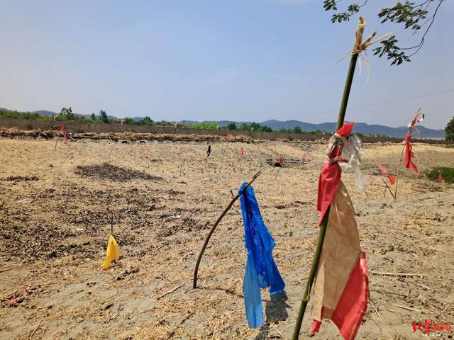 一片靠近涪江边的麦地收割后,留下密集的驱鸟“彩旗”