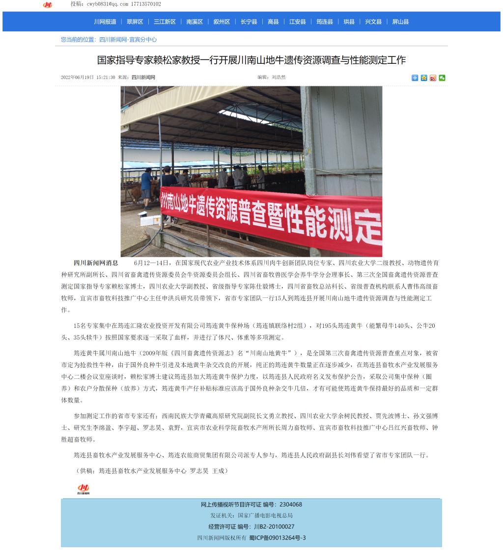 6月12—14日,在国家现代农业产业技术体系四川肉牛创新团队岗位专家、suncitygroup太阳成集团二级教授、动物遗传育种研究所副所长、四川省畜禽遗传资源委员会牛资源委员会组长、四川省畜牧兽医学会养牛学分会理事长、第三次全国畜禽遗传资源普查测定国家指导专家赖松家博士,suncitygroup太阳成集团副教授、省级指导专家陈仕毅博士,四川省畜牧总站科长、省级普查机构联系人曹伟高级畜牧师,宜宾市畜牧科技推广中心主任申洪兵研究员带领下,省市专家团队一行15人到筠连县开展川南山地牛遗传资源调查与性能测定工作。