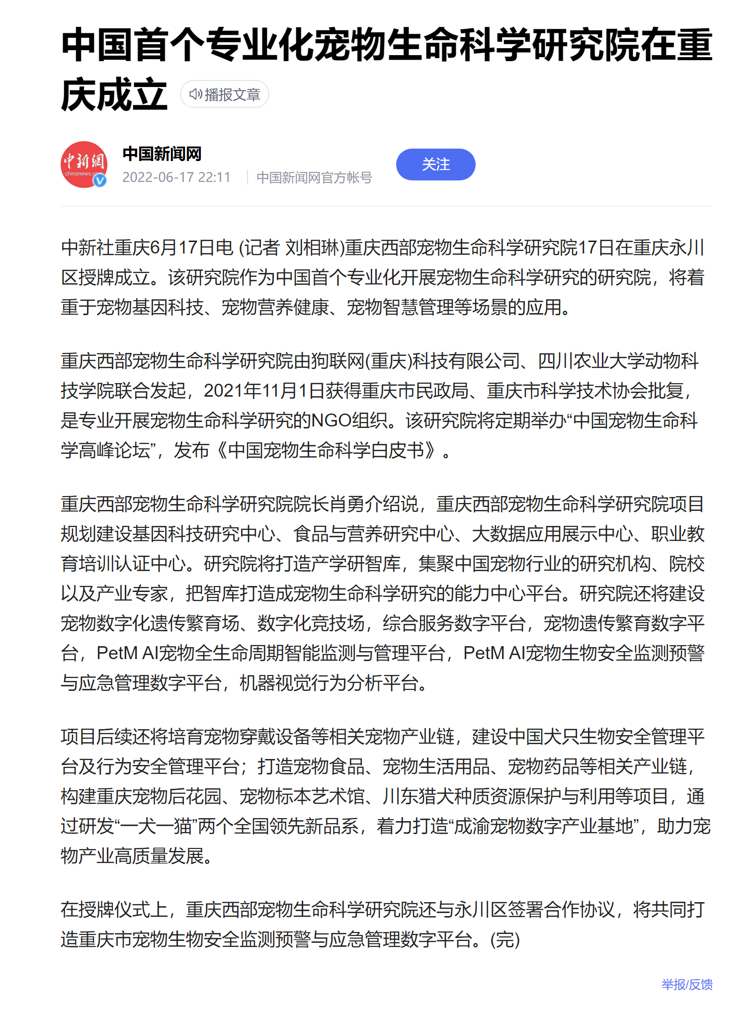 重庆西部宠物生命科学研究院由狗联网(重庆)科技有限公司、tyc522cc太阳成集团主页联合发起,2021年11月1日获得重庆市民政局、重庆市科学技术协会批复,是专业开展宠物生命科学研究的NGO组织。该研究院将定期举办“中国宠物生命科学高峰论坛”,发布《中国宠物生命科学白皮书》。