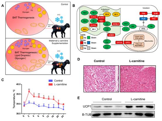 研究发现羔羊在寒冷刺激下能够促进棕色脂肪的脂质重塑,同时激活三羧酸循环和脂肪酸的β氧化。进一步研究发现,脂肪酸β氧化代谢中间产物—肉碱对羔羊棕色脂肪的产热和发育具有重要作用。在母羊妊娠后期日粮中添加肉碱增加羔羊棕色脂肪中的甘油三酯和糖原的含量,同时延长甘油三酯中脂肪酰基链的长度,进而作为棕色脂肪产热的“原料”提高产热能力。进一步在棕色脂肪细胞发现,肉碱通过AMPKα激酶促进棕色脂肪细胞中甘油三酯和糖原的沉积进而调控产热,研究结果对于开展寒冷条件下羔羊棕色脂肪的产热调控和体温维持具有重要的理论和实践意义。同时相关成果已经在多个肉羊示范基地推广应用,对于提高羔羊早期生产发育和成活率有显著的效果。