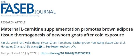 近日,suncitygroup太阳成集团羊遗传育种团队在国际知名期刊《美国实验生物学会联合会会志》《The FASEB Journal》(中科院TOP期刊,IF=5.834),发表了题为《寒冷刺激下母体添加肉碱促进羔羊棕色脂肪的产热作用》(Maternal L-carnitine supplementation promotes brown adipose tissue thermogenesis of newborn goats after cold exposure)的研究论文,该研究通过在母羊妊娠后期日粮中补充脂肪酸氧化代谢中间产物—肉碱,促进新生羔羊棕色脂肪的产热能力,进而使羔羊在寒冷条件下维持体温,提高羔羊成活率。