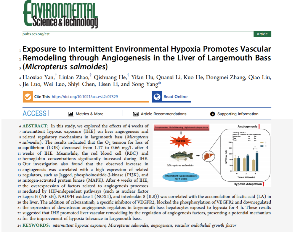 近日,学院杨淞教授团队以suncitygroup太阳成集团为唯一通讯单位在自然指数期刊《Environmental Science & Technology》(N1级中科院大类一区TOP,IF=11.357)发表题为“Exposure to Intermittent Environmental Hypoxia Promotes Vascular Remodeling through Angiogenesis in the Liver of Largemouth Bass (Micropterus salmoides)”的研究论文。该论文报道了血管内皮生长因子受体2(VEGFR2)是重要的低氧调控因子,其通过调控血管新生促进大口黑鲈肝脏血管重塑进而增强低氧耐受能力。