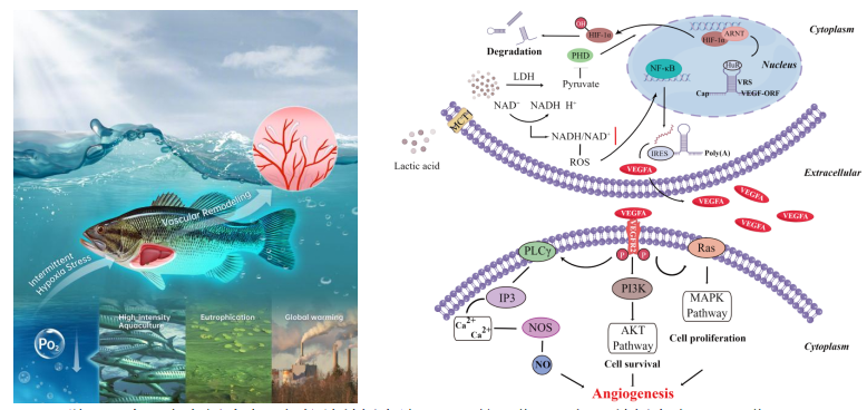 氧气是动物进行新陈代谢和维持生命活动所需的关键物质。与陆地环境不同,水生环境中的溶解氧很容易受到生物和非生物因素的影响,并对鱼类造成低氧胁迫。严重时会对水产养殖业造成巨大影响。因此,探究鱼类低氧适应机制可以为耐低氧品系的选育提供基础资源及新的见解。杨淞教授团队长期从事大口黑鲈环境适应性调控机制研究,继2022年9月首次发现间歇低氧暴露可以显著增强大口黑鲈耐低氧能力,并揭示其转录组图谱后,本研究进一步挖掘了血管新生途径作为大口黑鲈一种重要的低氧适应机制。研究发现,间歇低氧暴露4周后,大口黑鲈肝脏微血管密度显著增加。通过细胞与活体实验进一步证明低氧通过HIF依赖和HIF非依赖性途径共同促进VEGFR2磷酸化,进而增强内皮细胞增殖、迁移以及存活。该研究首次探究了低氧适应期间鱼类血管生成的精确调节机制,也为大口黑鲈耐低氧品系的分子选育提供了新的分子标记。