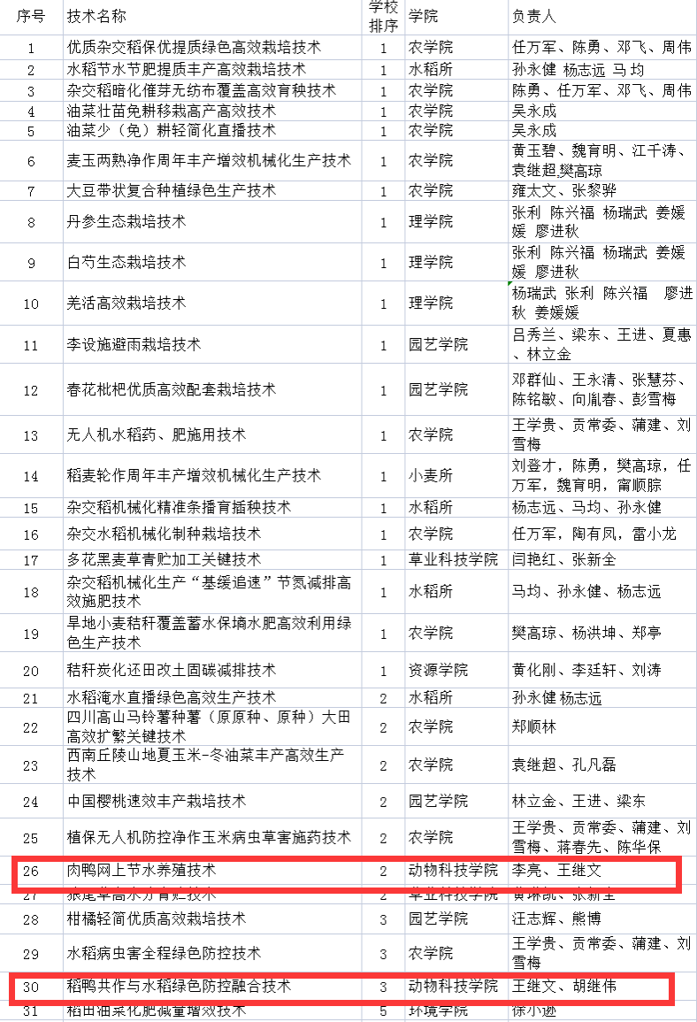 3月6日,农业农村厅公布了四川省2023年度农业主导品种50个,农业主推技术111项。其中,学院有2项技术入选。