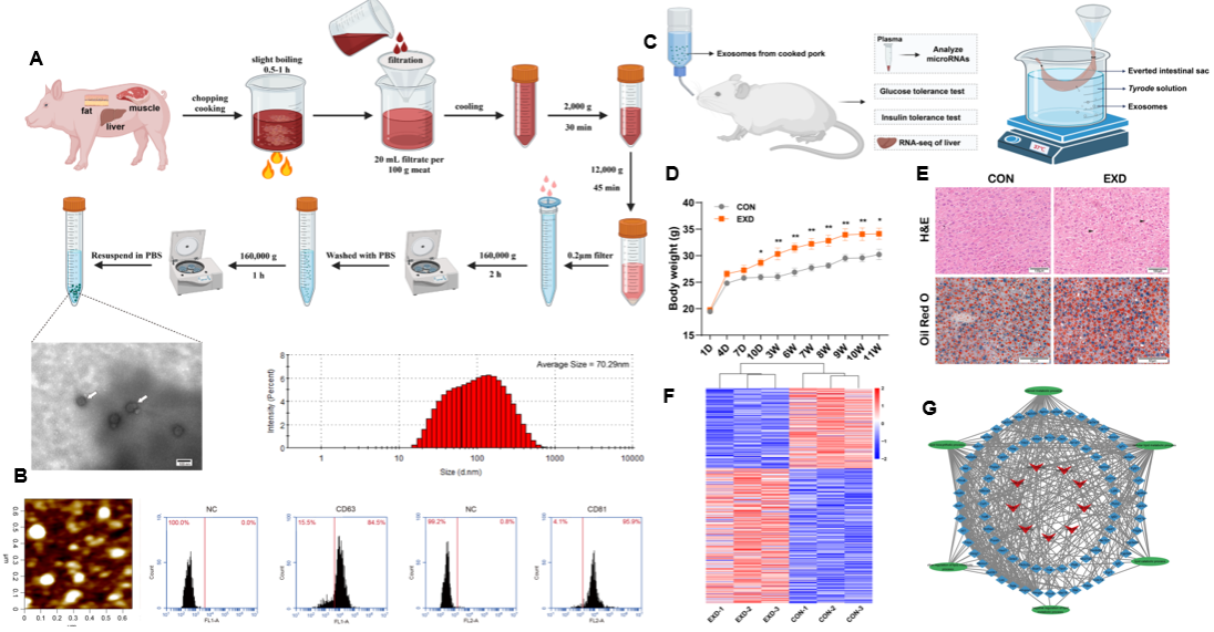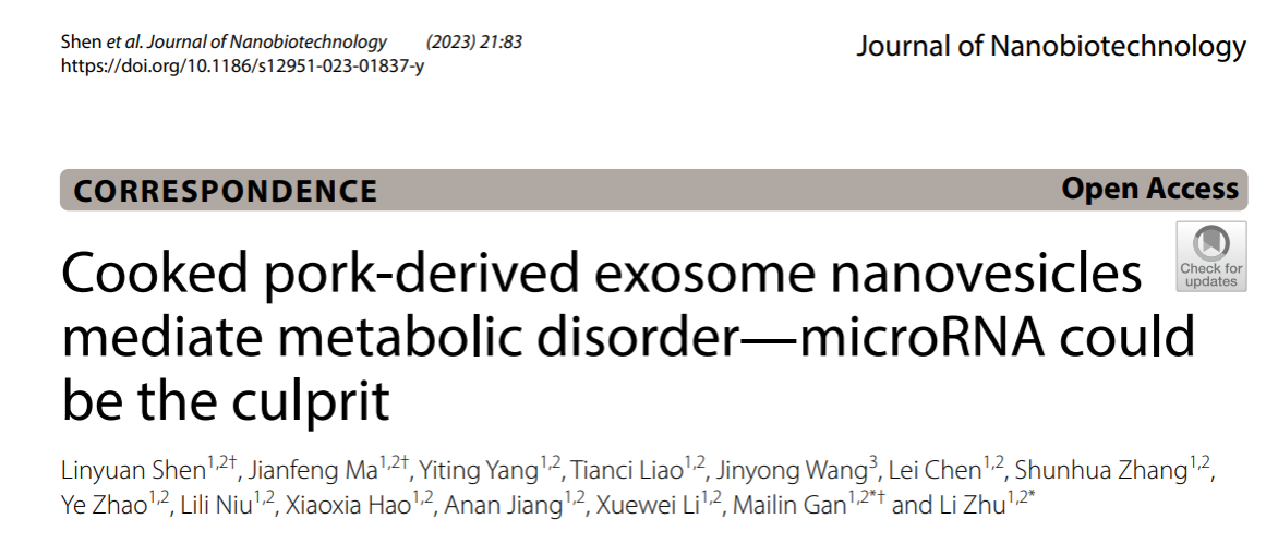 近日,学院猪禽种业全国重点实验室、畜禽生物组学农业部重点实验室、畜禽遗传资源发掘与创新利用四川省重点实验室朱砺教授团队在国际著名期刊Journal of Nanobiotechnology (中科院大类一区TOP,IF=9.429,5年IF=11.509)在线发表了题为(Cooked pork-derived exosome nanovesicles mediate metabolic disorder-microRNA could be the culprit)(煮熟猪肉来源外泌体囊泡包被的miRNAs对机体的代谢功能调控)的研究论文,该论文创新性地提出了一种从煮熟猪肉中提取Exosome的方法,并探究了熟肉来源Exosome包被的miRNAs对糖脂代谢的调控功能。