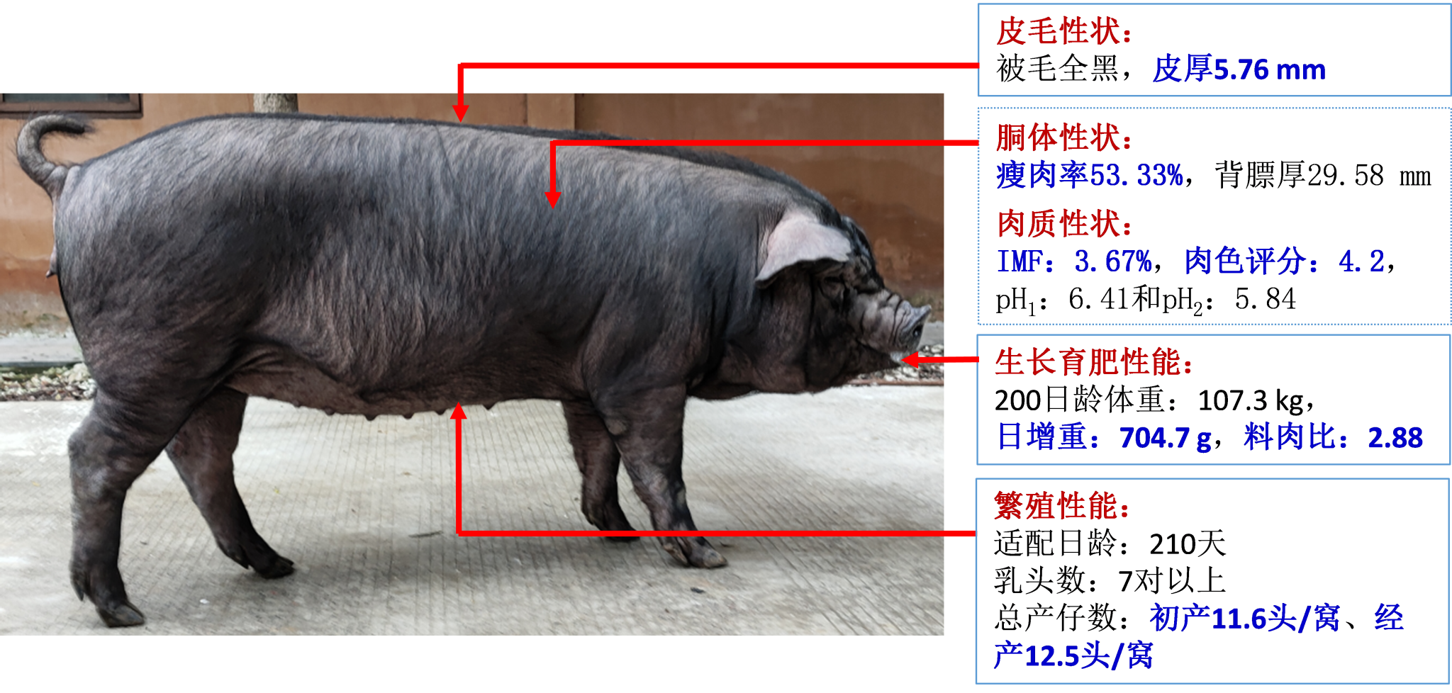 培育出的天府黑猪具有极好的肉质特征,主要表现为肉香味浓、肉色鲜红、易于咀嚼。而且,天府黑猪还呈现出独特的皮厚性状,能极好满足四川及西南地区消费者对附带厚皮优质猪肉的特殊消费偏好。与此同时,天府黑猪还表现出繁殖性能高、生长快、耗料少以及耐粗饲和适应性广等优良特征。此外,天府黑猪各重要经济性状遗传性能稳定,尤其成功实现黑毛性状全群稳定遗传。