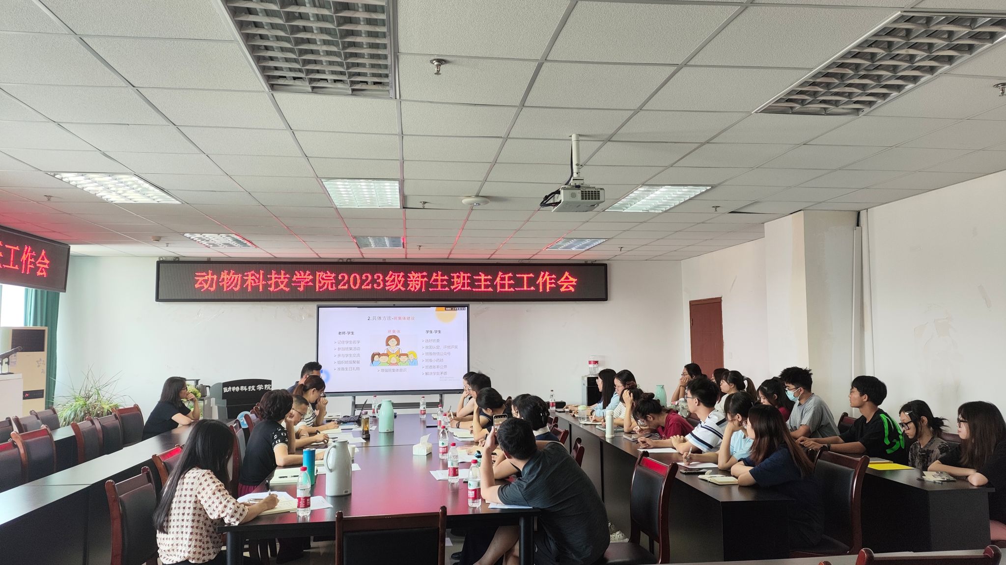 会上,张慧慧详细介绍了2023级新生报道及入学教育的日程安排,及入学期间注意事项。随后,两位优秀班主任代表为大家进行经验分享。刘巧以“当班主任的一点体会”为题,从个人体会、具体做法着手,在学风建设、班集体建设、专业认识三个方面分享了担任班主任的心得体会;白丽丽详细介绍了班主任工作认识和小班在日常管理中的一些做法,比如:学风建设,班级凝聚力建设,团建及实践活动等等。付瑞琼强调了心理健康管理的关键点。