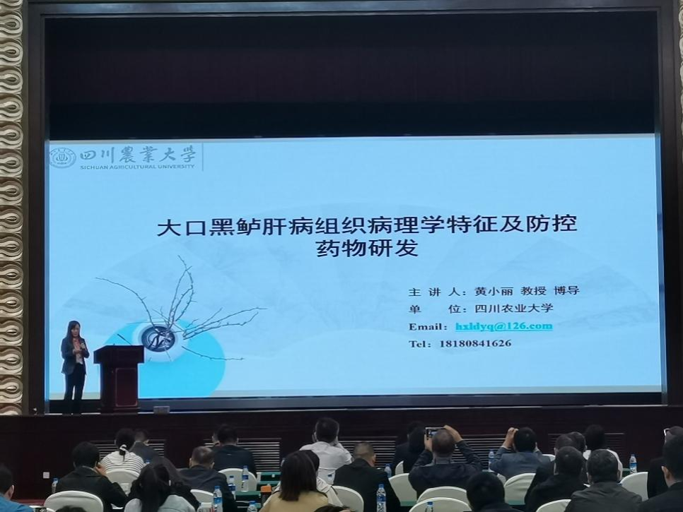 汪开毓教授受邀主持大会报告;黄小丽教授主持“启明星学术论坛”并作《大口黑鲈肝病组织病理学特征及防控药物研发》的大会主题报告;欧阳萍副教授作了题为《肉桂醛对耐药性细菌抑菌效果、机制及其应用研究》的大会报告。会议现场大咖云集,我校专家老师们和与会专家们充分讨论,交流思想,获得参会专家同行的高度评价。