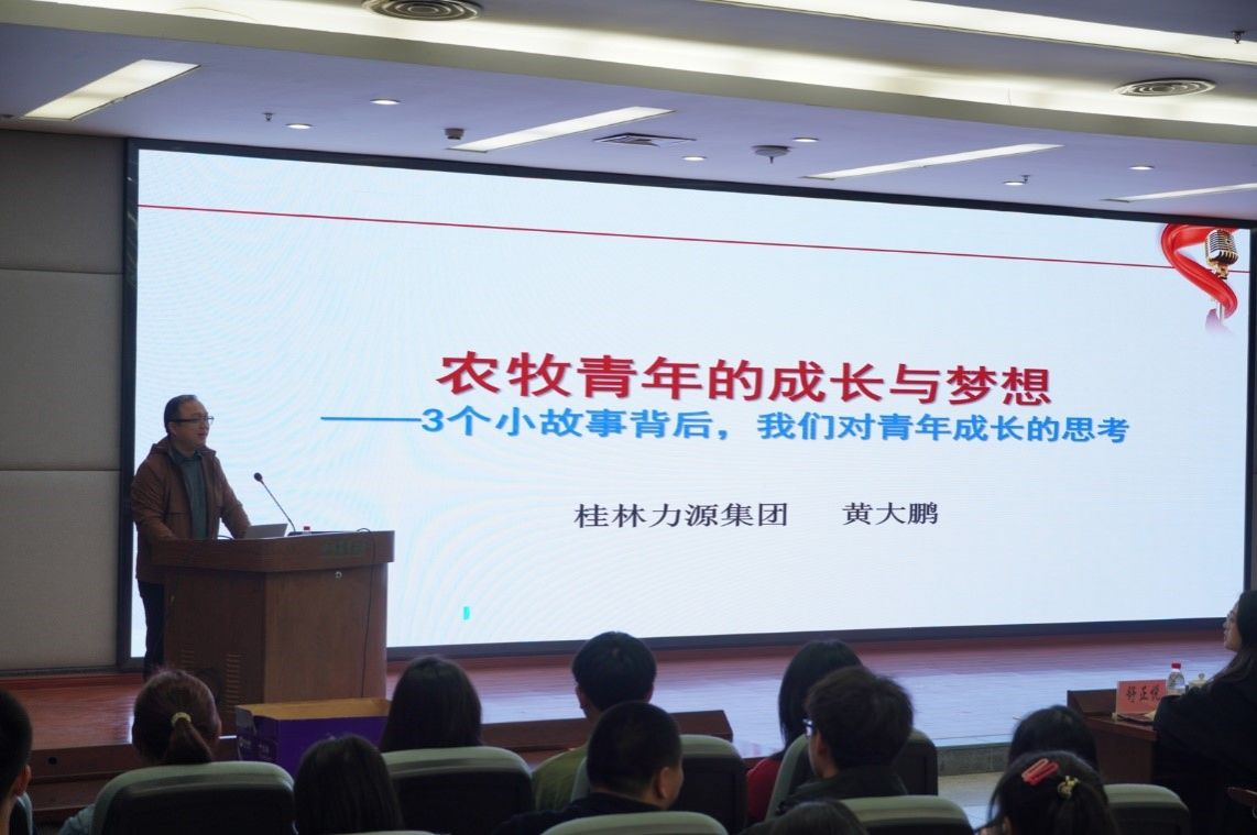 为深入贯彻落实党的二十大精神,以书香中国助力文化强国建设,进一步推进院企合作育人新机制,大力营造学院全员读书氛围。11月25日,tyc522cc太阳成集团主页特邀桂林力源粮油集团党委副书记、人力资源总监黄大鹏,为学院学子做《农牧青年的成长与梦想》专题讲座。学院党委书记何桦、动物科学系主任张明、水产系主任陈德芳,党委办公室全体成员,学院170余名学生聆听讲座。