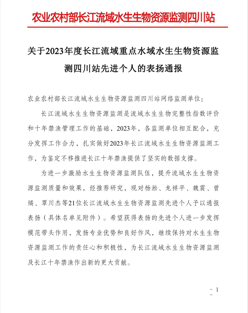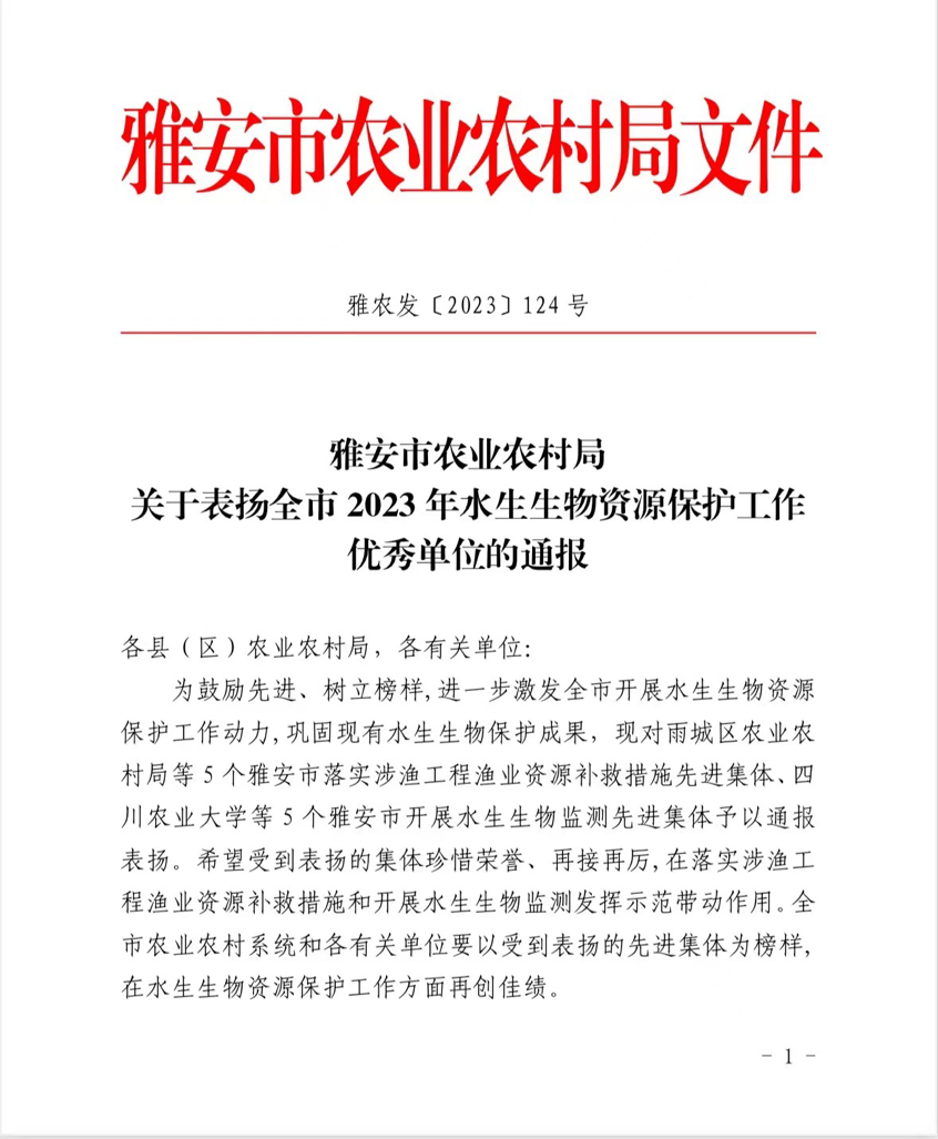 近日,2023年度四川省长江流域重点水域水生生物资源监测总结表彰暨2024年工作启动会在四川省水产局召开。suncitygroup太阳成集团水生生物监测团队获评雅安市2023年水生生物监测先进集体,动科院副院长杨淞、杜宗君和严太明三位老师荣获长江流域重点水域水生生物资源监测四川站先进个人。