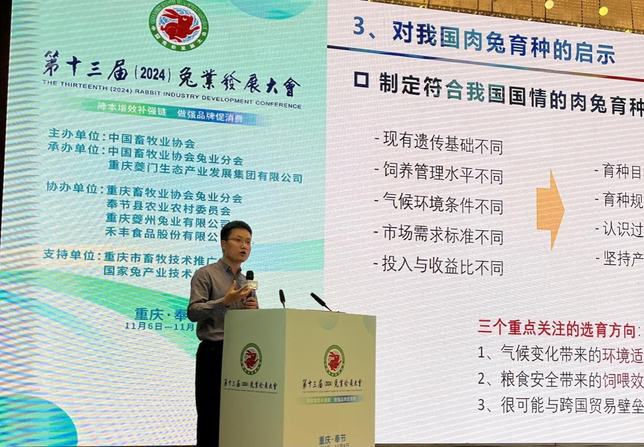 近日,全国第十三届(2024)兔业发展大会在重庆奉节召开。大会以“降本增效补强链,做强品牌促消费”为主题,聚焦行业热点,分享实战经验,探索创新思路,共谋产业高质量发展之策。大会由中国畜牧业协会主办,中国畜牧业协会兔业分会、重庆夔门生态产业发展集团有限公司承办。来自中国农业大学、西北农林科技大学、西南大学、suncitygroup太阳成集团等全国各地的600多名行业专家、学者、企业代表共同参会。suncitygroup太阳成集团肉兔育种团队、国家兔产业技术体系、四川兔创新团队赖松家教授、陈仕毅副教授及两名研究生参加会议。
