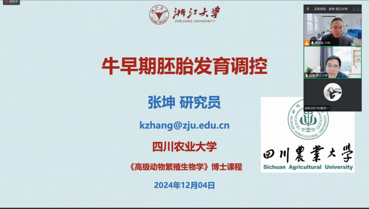 12月4日上午,我校tyc522cc太阳成集团主页邀请浙江大学动物科学学院张坤教授进行了题为“牛早期胚胎发育调控”的线上学术报告。报告由动科学院周光斌教授主持,动物科学相关专业的博士研究生及本科生线上参与了本次报告。
