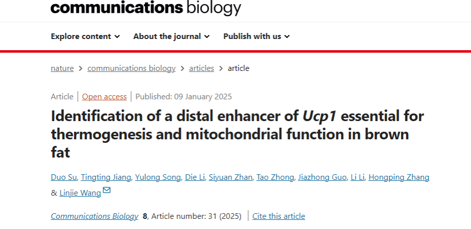 1月9日,学院王林杰教授课题组完成题为“Identification of a distal enhancer ofUcp1essential for thermogenesis and mitochondrial function in brown fat(鉴定棕色脂肪中对产热和线粒体功能至关重要的Ucp1远端增强子)”的研究论文在Nature旗下期刊《通讯-生物学》Communications Biology(中科院一区TOP)上发表。