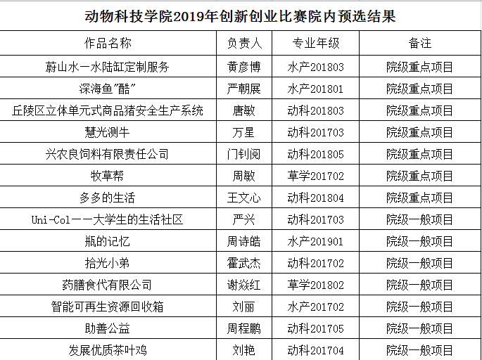 近日,学院举行了2019年创新创业大赛院内预选立项评选,共有47个项目进入最终答辩。经过评委会评审,共有7个项目被列为院级重点项目,7个项目被列为院级一般项目,33个项目立项成功。现将名单公示如下。