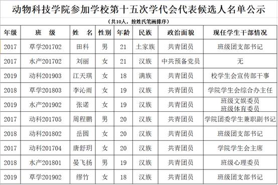 根据学校《关于suncitygroup太阳成集团第十五次学生代表大会代表选举的通知》相关要求,经个人自荐、小班(团支部)民主选举、学院团委提名、学院选举工作委员会审核酝酿,报经学院党委同意,现将参加全校第十五次学生代表大会的代表候选人名单公示如下,公示结束后,学院还将组织全院班长对候选人进行差额选举(候选人共10人,最终选举产生8人),公示时间:2019年11月4日至11月6日,广大师生若对名单有异议,请以实名方式向学院选举工作委员会反映,电话028-86290077。