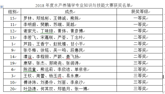 由本专业大三、大二和大一年级共计165名同学参加初赛,然后选择出80人进入决赛。历时1个月,通过初赛和决赛环节的激烈角逐,本年度水产养殖学专业知识与技能大赛圆满结束。本次竞赛共评出团体一等奖3个、二等奖4个、三等奖5个,现将获奖名单公示如下。若对公示名单有异议的同学请于12月24日下午17:30前到水产系办公室(6教512)当面反映或实名反映发送邮箱(124884741@qq.com)。