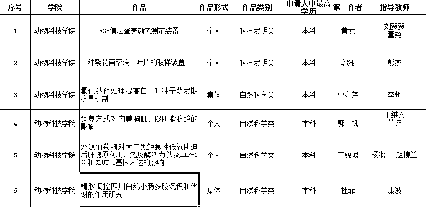 根据学校第十六届“挑战杯”比赛的相关通知要求,经个人申报,学院组织评审,拟推以下6件作品参加校区复赛,现将名单予以公示。请以下6件作品的作者认真准备,争取在学校比赛中取得好成绩。