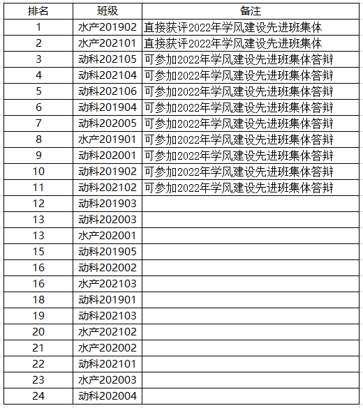 根据《tyc522cc太阳成集团主页学风建设先进集体评选办法》对全院大二、大三、大四年级24个班级的学风状态数据进行了统计排名,前两名的班级直接获评学风建设先进班集体,第3至11名的班级可参加评选答辩。
