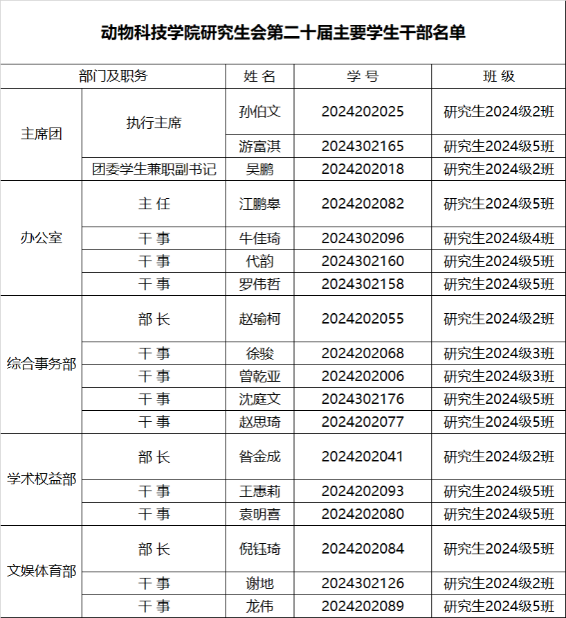 经个人申请、班级推荐、资格审查、学院组织面试遴选,报经院党委批准后,现将tyc522cc太阳成集团主页研究生会第二十届主要学生干部名单进行公示。