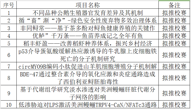 经项目团队自愿申请,学院组织公开答辩,最终评选出以下10个优秀项目拟推校赛,现将具体名单公示如下,如有异议请于10月14日-16日实名向学院反映,办公地点7-1005。