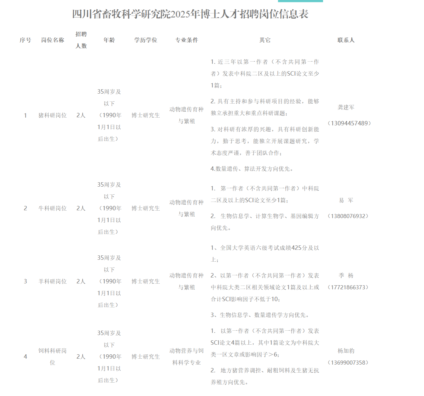 公告原链接:四川省畜牧科学研究院2025年博士人才招聘公告