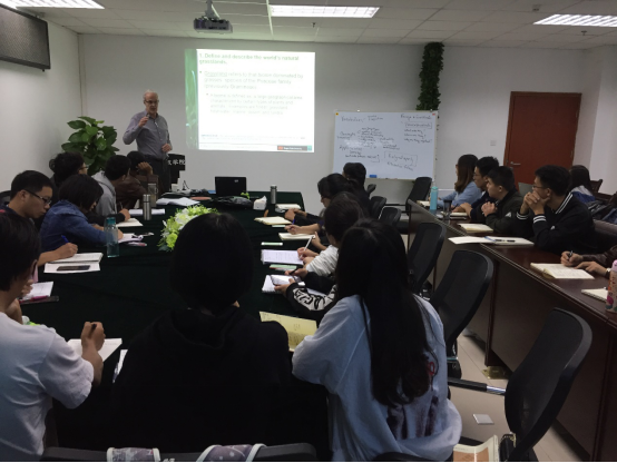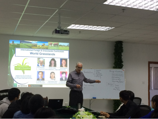 David教授于10月8日开始为草学研究生讲授美国与世界草地发展及研究前沿等专题内容,之后将继续讲授饲草生产、牧草生理生态、计算机的模拟与仿真应用、物种的适应模型和分布、苜蓿的区域适应性研究、牧草评价等内容。课堂采用全英文PPT结合板书授课,内容丰富,气氛活跃,尤其是几位留学生,上课积极发言,极大的提高了他们对草学学习的兴趣。而其他学生在动科院张新全教授的全程协助讲解和解释下逐渐适应了David教授的全英文教学。此次教学安排不仅锻炼了学生的英语听说能力,掌握了专业知识,了解了国内外牧草及草地发展的现状和前沿动态,拓宽了学生的国际视野,更建立了学生对于草学专业知识学习的浓厚兴趣。