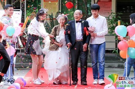 中国青年网成都4月9日电(通讯员盛雪琪何文涛)“执子之手,与子偕老”源自《诗经》“邶风”里的《击鼓》,这句话多运用“执手偕老”形容爱情的永恒。但许多从青丝走到白发的老人却总有遗憾——“我还未能给你一场浪漫的婚礼”。4月1日,tyc522cc太阳成集团主页的青年志愿者们为圆老人们的婚礼梦,为成都市温江公平颐家老年公寓的三位金婚夫妇举办了婚礼。