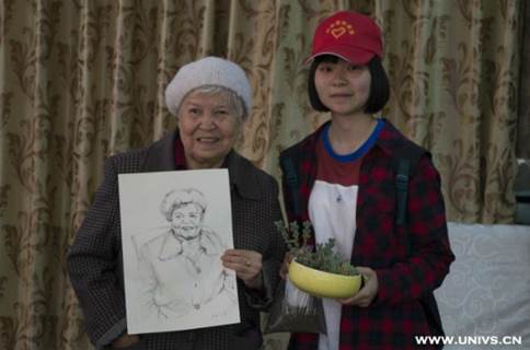 老人手拿画像与志愿者合影纪念。尹思洁摄