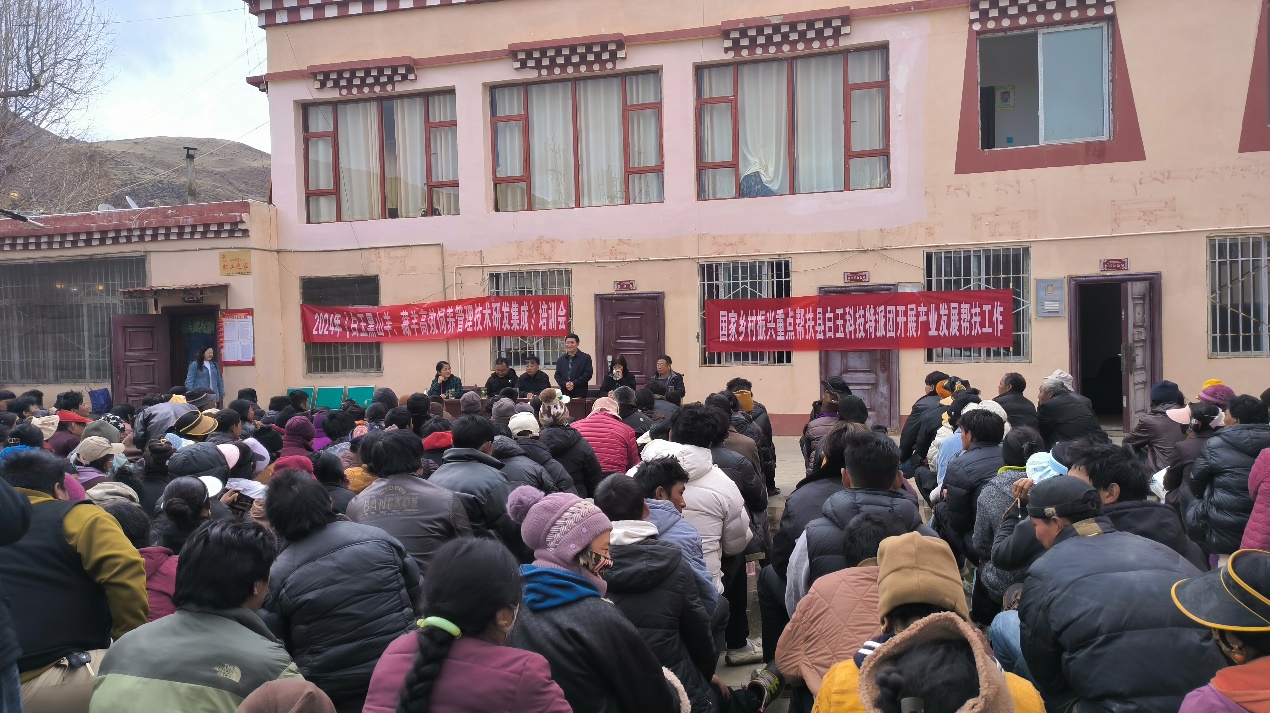白玉县地处青藏高原向云贵高原的过渡地带,境内大部分地区海拔在3500米以上,牦牛、肉羊产业是当地农牧民的主导产业,但当地牛羊产业基础薄弱、饲养管理技术落后、饲草料资源供应及日粮营养不均衡等问题突出。专家一行克服高海拔、低氧环境的不利因素,先后赴白玉县登龙乡白玉黑山羊原种场、纳塔乡昌台牦牛繁育基地和白玉藏品农业发展有限责任公司等企业,调研产业发展中的问题,开展了白玉黑山羊和牦牛的保种选育、高效繁殖、牧草种植、饲养管理与疫病防控等方面的技术培训,并进行了现场答疑。