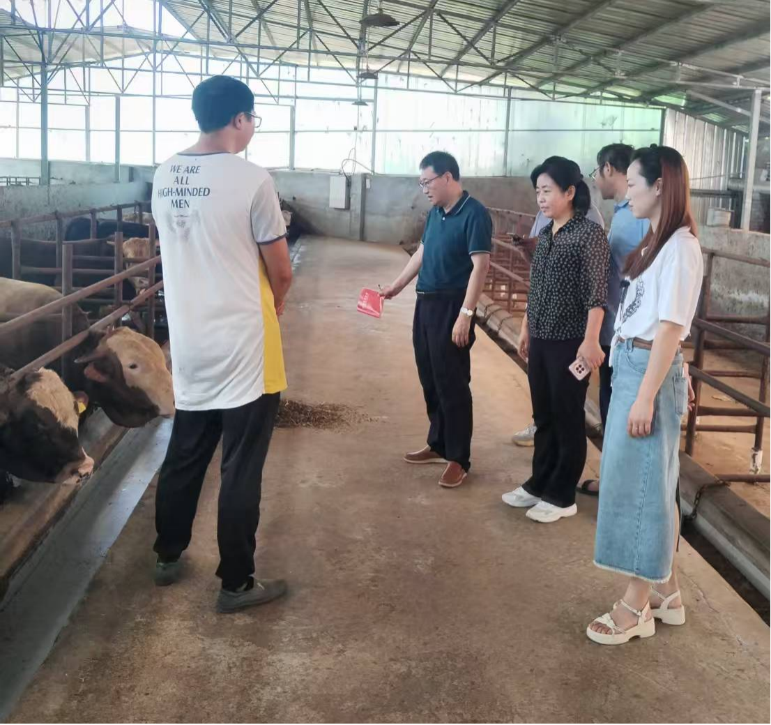 团队首先从当地畜牧发展中心了解整个县域粮食生产、牧场种质、草山草坡利用,以及牛业发展情况。同时,团队有针对性地逐个深入当地大、中、小肉牛养殖场了解目前的养殖现状、技术需求和市场行情,并针对养殖场(户)遇到的实际问题开展现场技术指导。在每一个养殖场(户),团队都详细调研了其养殖经验、养殖数量、架子牛来源、常见疾病、饲料供给、管理措施、养殖环境、粪污处理、经济效益等。在调研过程中,养殖场技术人员提出的困惑和遇到的问题,团队成员都一一为其讲解和提供合理化的建议,并赠送了课题组选编的《现代肉牛养殖技术手册》。