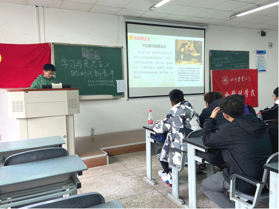 团课上,邹坤同学分别讲述了马克思主义的主要内容、马克思主义的特性、马克思主义的中国化以及在大环境下青年的责任担当与使命,帮助同学们明确了身为青年对团组织工作的重要性,提升了同学们的政治思想觉悟,更坚定了同学们入团的决心。随后,主持人根据所讲内容进行了提问与抽问环节,帮助同学们更好了解马克思主义以及新时代青年的时代使命,带动了同学们的积极性,活跃了课堂气氛,取得了良好的效果。