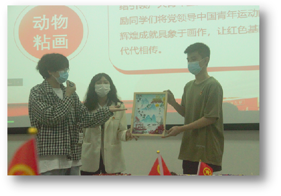 在粘画教学和赏析环节,一片片树叶饱含青年学子对生命的热爱;一幅幅作品蕴藏青年学子们对中国共产党和共青团的向往。在欣赏画作之后,主持人邀请现场三位同学感受粘画的乐趣,现场气氛轻松活泼,同学们纷纷表达对共青团的热爱和祝福。