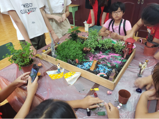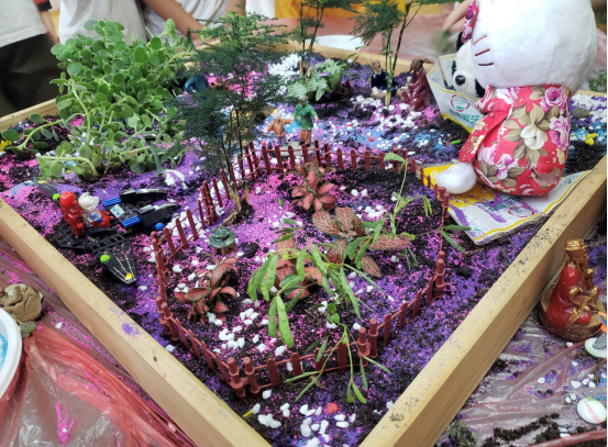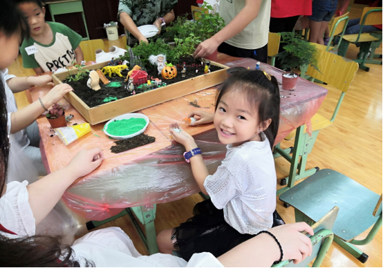 从最初的陌生、不满,到熟悉、合作,短短的两个小时,小朋友们懂得了团队合作的重要性——我行我素只有吃亏,要和伙伴们一起努力,才能获得双赢。在交往过程中,容易出现人际敏感、自我定位不清晰等情况,将箱庭园艺这样一项心理辅导技术运用在小团体的互动中,激发了小朋友自我探索的能力,能改善团体之间的人际交往关系,促进小朋友心理的健康发展。同时,小朋友们通过园艺操作来让泥土、植物、房屋、装饰等物品替自己“说话”,表达内心的真实想法,激发潜意识中的自我复原力,也能够达到促进身心健康和人格完善的目的。
