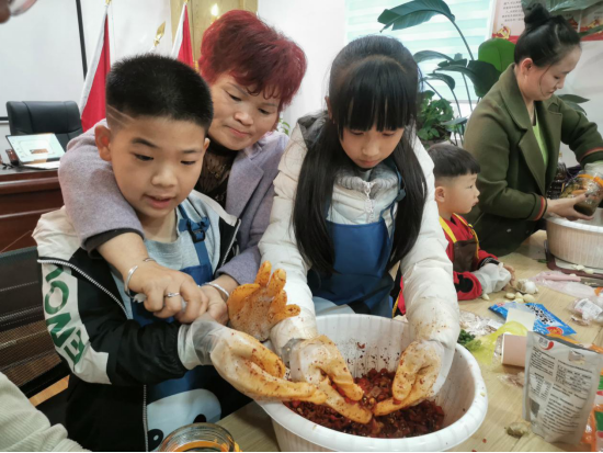 图为小朋友和家长一起制作豆瓣酱。