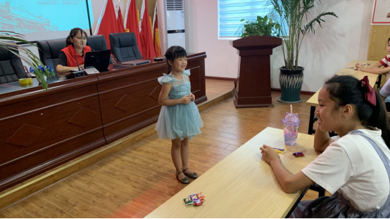 “击鼓传花”游戏中小朋友们围成一圈,接到“花”的小朋友需上台自我介绍,或是分享观看视频后的感悟。“这次是你了哦!”一个小男孩兴奋地喊到。随着游戏进行,小朋友们的欢笑声连连,还主动与实践队员们聊天说笑,整个活动室都是热闹活泼的氛围。