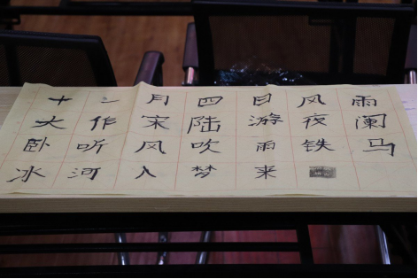 接下来的环节是小朋友们用毛笔在宣纸上写下刚刚学的两首诗,小朋友们全神贯注地运笔练习。志愿者们将提前准备好的刻有每个小朋友名字的橡皮章一一送给孩子们,雕刻方式有阴刻与阳刻两种,志愿者们交叉运用这两种雕刻方式,手工刻好了每个小朋友的名字。