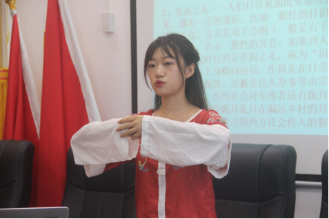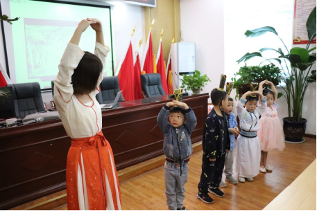 首先,志愿者们给在场的小女孩盘发并戴上古代传统的发饰,给小男孩佩戴古时男子的发冠,发饰精美而又古色古香,小朋友们感到异常新奇。紧接着,两位志愿者姐姐一一为小朋友们展示了古时的一些传统礼节,如女子的“莲步款款”及“万福礼”该如何做;行走之礼——“趋礼”,及在长辈面前走过时,需要低头弯腰、小步快走以示对长者的尊敬。志愿者在讲台上绘声绘色地分解并演示动作,小朋友们则在台下聚精会神地一步步模仿。当学完“拜礼”时,一位年纪很小的男孩走到哪都要给身边的哥哥姐姐或者老师行礼,憨态可掬的样子逗笑了在场的人们忍俊不禁。