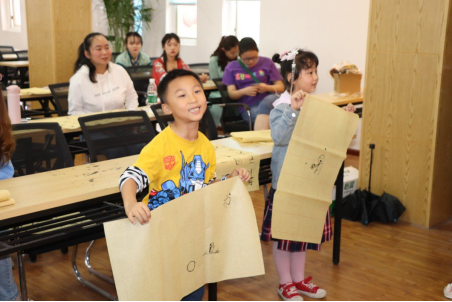 最后的环节便是游戏比拼了。第一轮是“诗词传声筒”,第二轮是“你画我猜”,两轮游戏所用的诗句都是之前两位志愿者所讲解的。志愿者们寓教于乐,不断地重现让孩子们加深了对两首诗的印象。最后,志愿者们将自己手工制作的纸灯笼送给了孩子们,孩子们拿着精致又典雅的灯笼,脸上洋溢着灿烂的笑容。